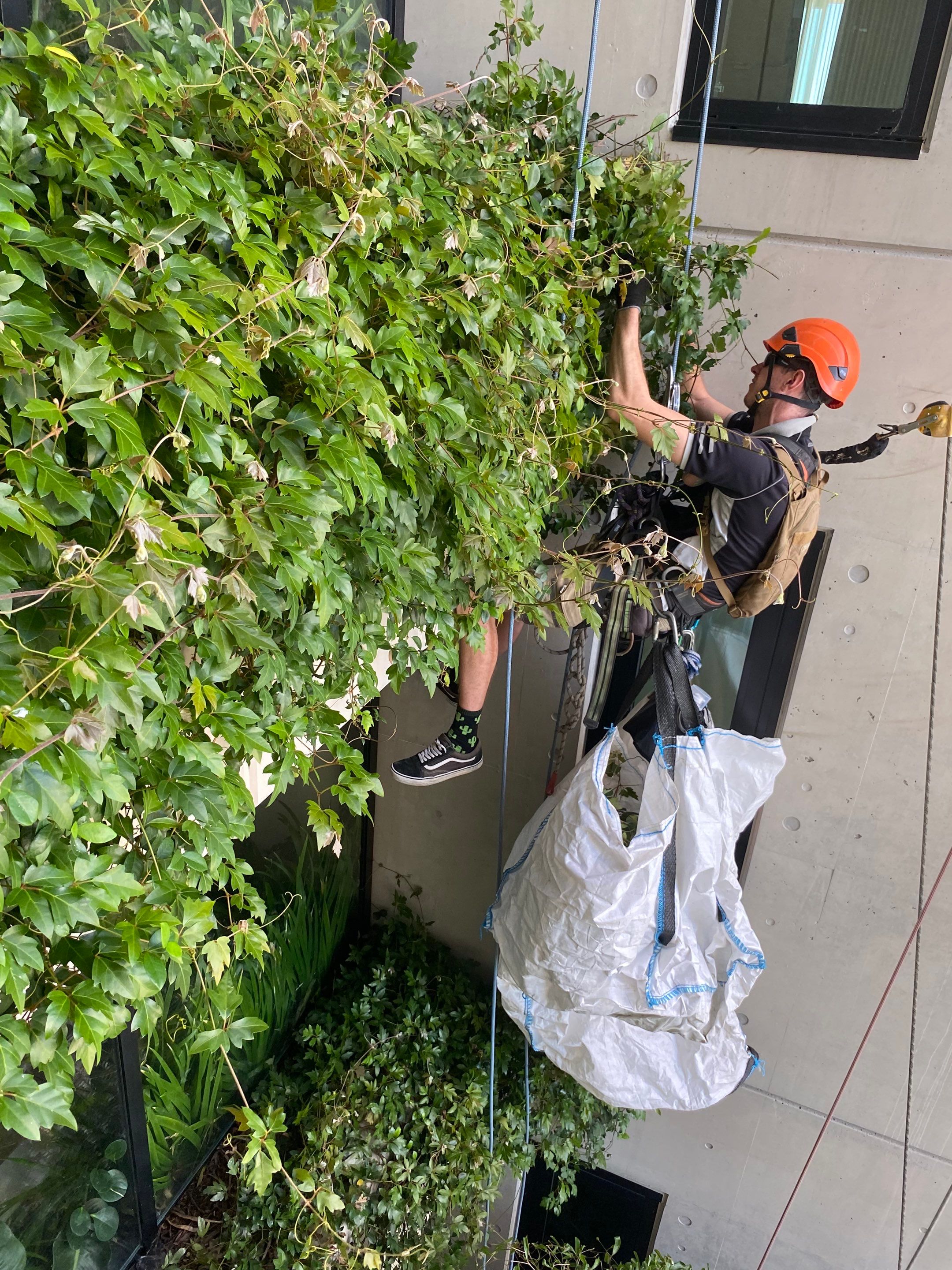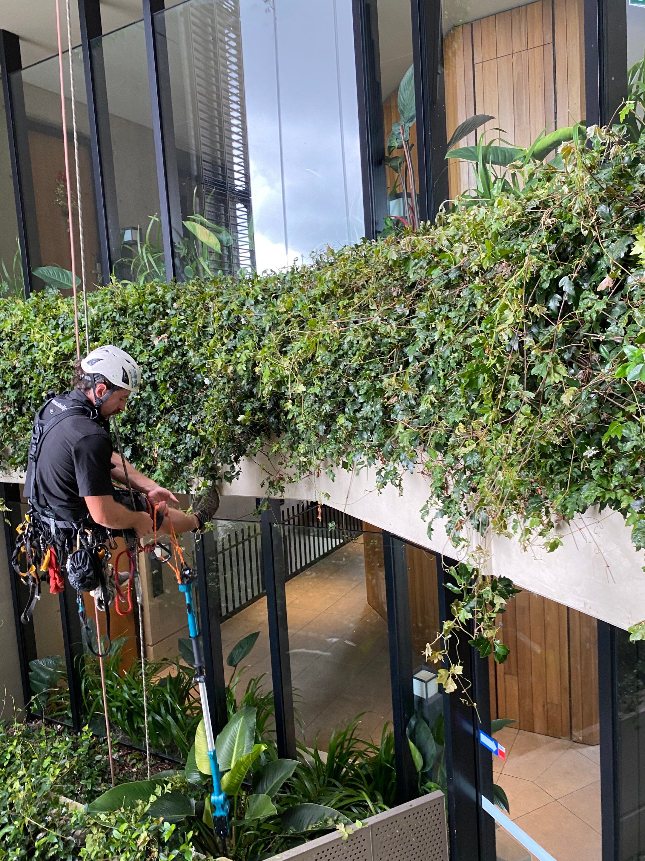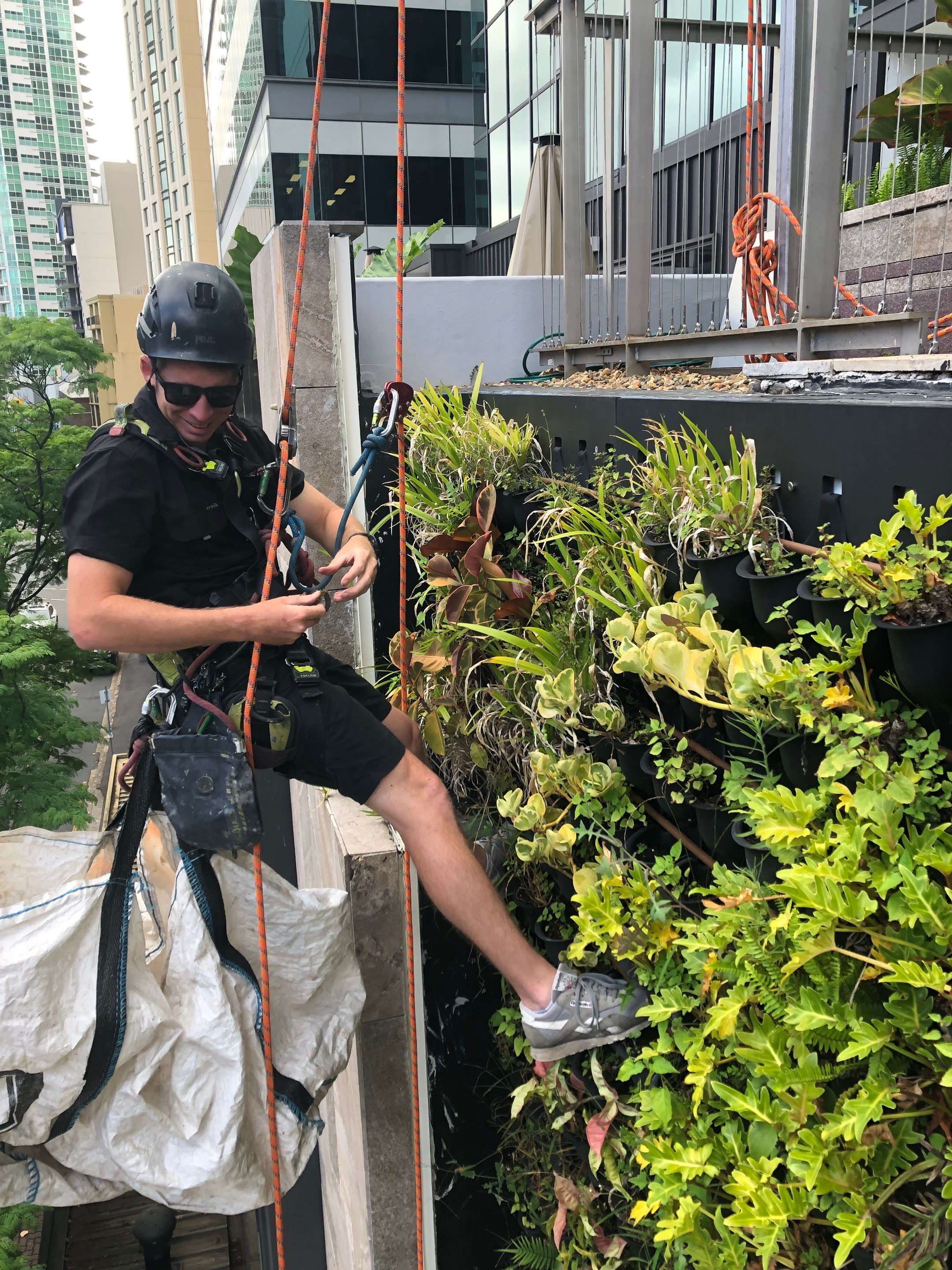 Specialist rope access maintenance for inaccessible gardens and green walls on high-rise buildings.